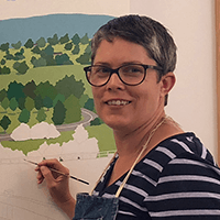 Sally’s painting style changed dramatically in the last decade. When asked about her new direction of landscape paintings, Sally stated, “I live in a tremendously beautiful part of the world. I love taking photos of the landscape. I need a starting point to play with colour and composition, and the scenery around me speaks to me.”